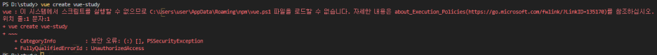 vscode 에서 ctrl+shift+p 로 shell default 를 cmd로 변경해도 같은 오류가 나서 결국 cmd 창을 켜서 했더니 프로젝트 만들어진다. 개짜증